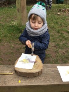 As well as growing in confidence whilst at Forest School and becoming more adventurous with their exploration, the children learnt a new skill of how to use a hammer, demonstrating great resilience and a ‘can do’ attitude.  Selecting their own choice of flowers, they transferred the dye from the flowers onto a piece a cloth, using their hammer.  This is an old Japanese art technique called ‘Hapa Zome’.  The effects were stunning!
