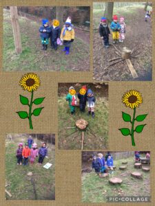The children then listened to the story ‘Little Sunflower’ before setting off in groups to create their own sunflowers using found resources at Forest School.  The children are definitely becoming sunflower experts as they were using some great vocabulary to describe the different parts of the sunflower as they searched for resources to create the seed head, petals, stem and leaves.