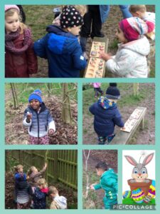 Is it a bird?  Is it a plane?  No, Miss Walton thinks she saw the tail end of the Easter Bunny hopping away from Forest School, leaving a trail of delicious looking chocolate eggs, which the children had great fun running around collecting!  Just to make sure we found them all, we used some ten frames to record our findings!