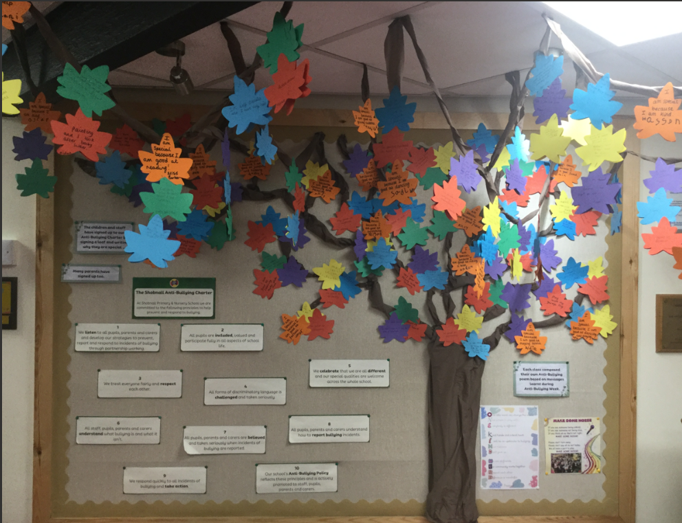 Having devised our ‘Shobnall Anti-Bullying Charter’ all children and staff were given their own coloured leaf to sign and write something that was different/special about them. This was displayed in our entrance hall to promote that we are all following and agree to the Shobnall Anti-Bullying Charter. We also encouraged parents to add their own leaves on to it!