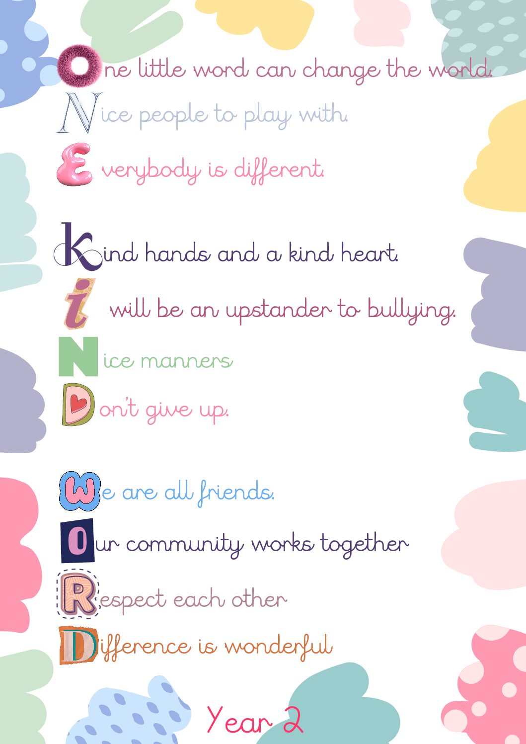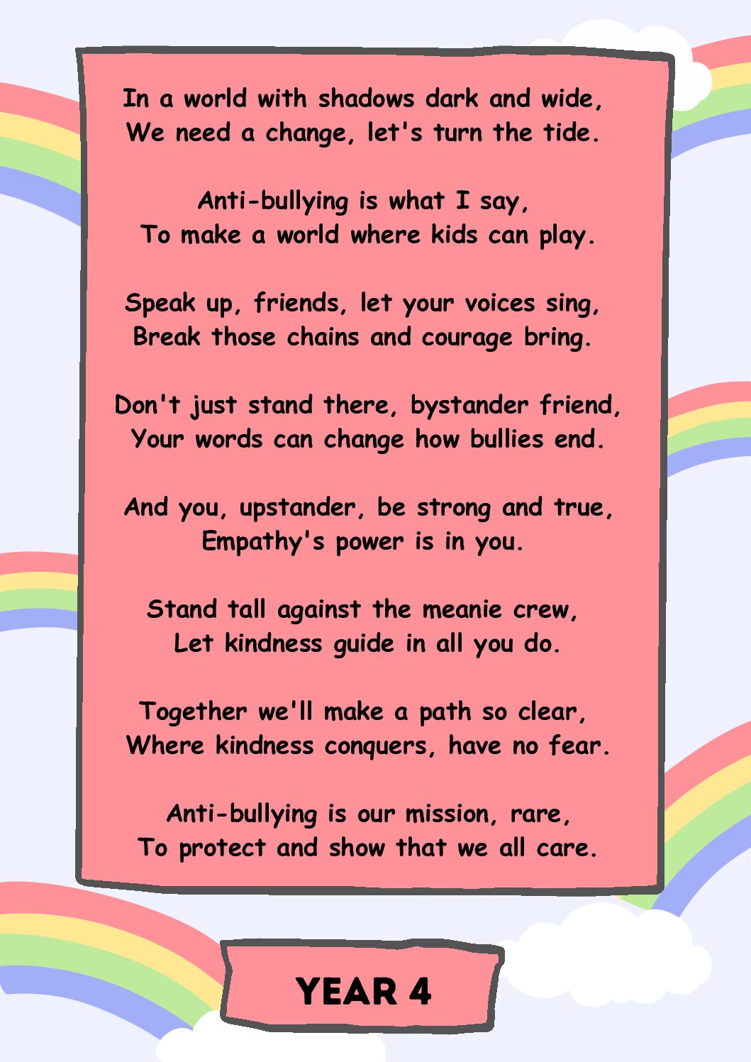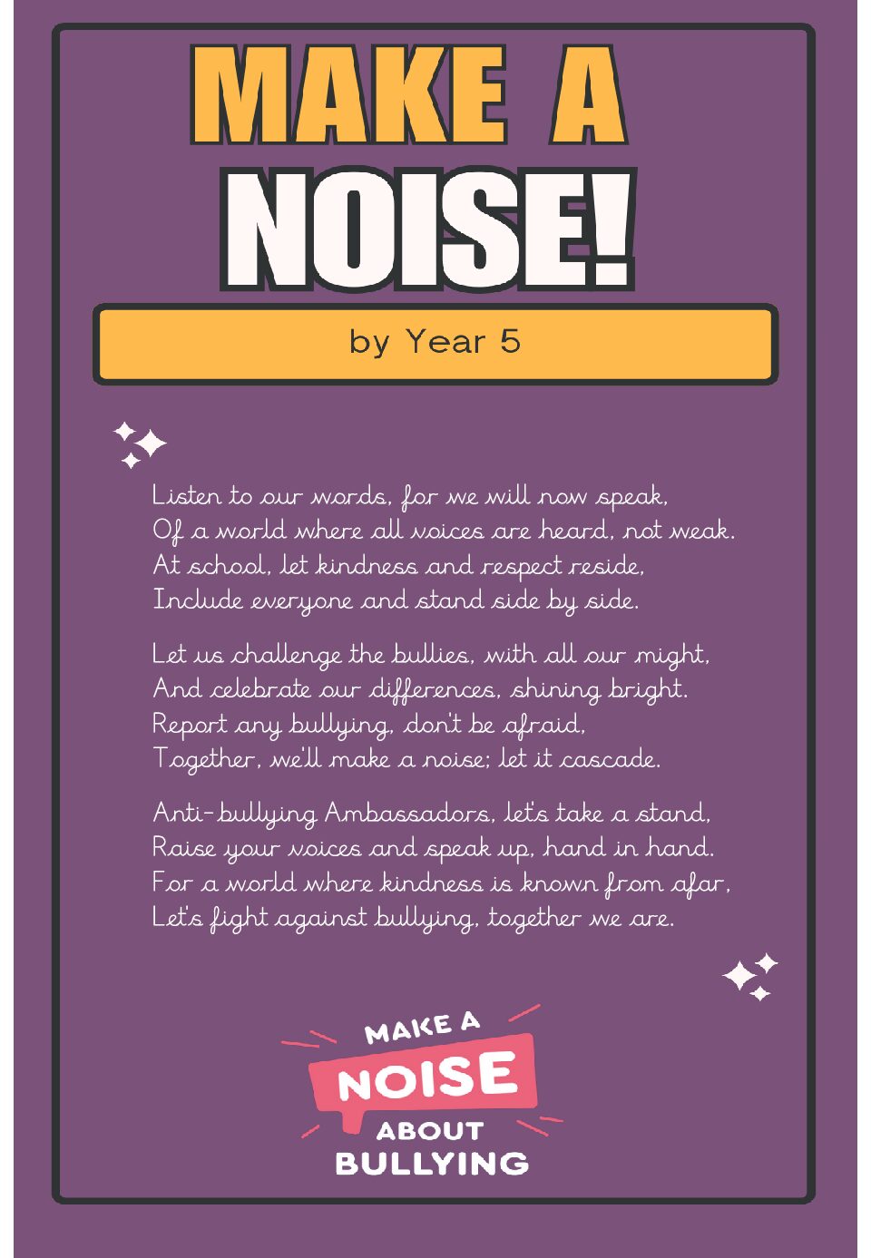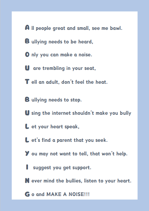 To promote the message of ‘Make a Noise About Bullying’, each class wrote their own poem. Here is a selection for you to read, demonstrating the brilliant creativity of our children…