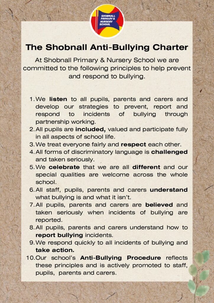 Across the school we all contributed to a whole school charter with 10 principles to prevent and respond to bullying. Here is a copy of our ‘Shobnall Anti-Bullying Charter’…