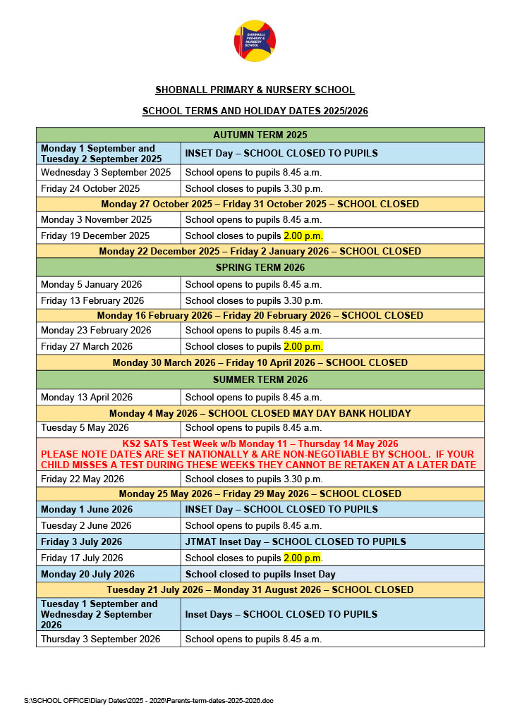 To view / print Shobnall School Terms & Holiday Dates 2025-2026 click the link below
