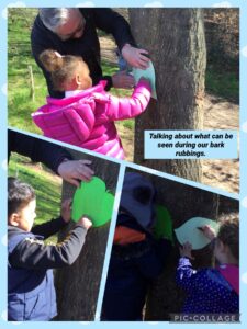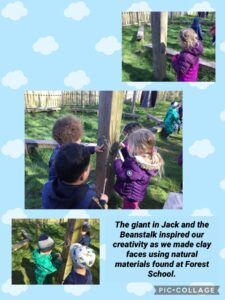 Lots of children had great fun venturing off with friends, looking at our pond area and wondering what could live in there.  Others tried their hand at many different activities based on this week’s class fairy tale, Jack and the Beanstalk. We planted our own beans, looked at the patterns on our bark rubbings, did a spot of leaf threading and used lots of natural materials to create the giant’s face using clay.