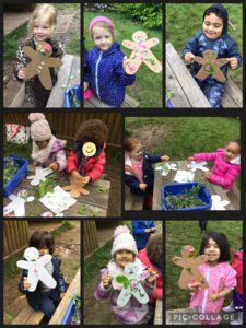 Using lots of natural resources, we created Gingerbread Men on both a small and large scale! Children searched for appropriate resources to stick onto their Gingerbread Men templates, looking out for different colours, shapes and textures, whereas on the field a gigantic Gingerbread Man was taking shape with the help from the whole class!