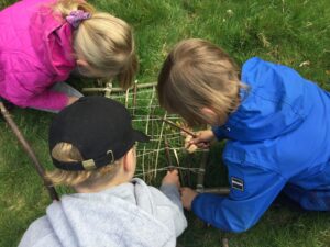 This week, one group were creating beads from the branches of an Elder tree. The children used secateurs to cut a small piece of branch to create a bead. These branches have a pulp-like centre which is easy to push out using a skewer. Once the centre had been pushed out, the children could thread these onto a string to create a necklace or bracelet. Some of the children decided to peel away the bark on some of their beads to create pretty patterns. This group also did some weaving. The children found a range of sticks and foliage and the wove these onto the large and small templates.
