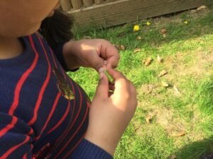 This week, one group were creating beads from the branches of an Elder tree. The children used secateurs to cut a small piece of branch to create a bead. These branches have a pulp-like centre which is easy to push out using a skewer. Once the centre had been pushed out, the children could thread these onto a string to create a necklace or bracelet. Some of the children decided to peel away the bark on some of their beads to create pretty patterns. This group also did some weaving. The children found a range of sticks and foliage and the wove these onto the large and small templates.